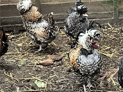 The birds have a small v-shaped comb and an abundant crest of feathers on the crown of the head. They are kept for show or for ornament. There are bearded, non-bearded and frizzle varieties.